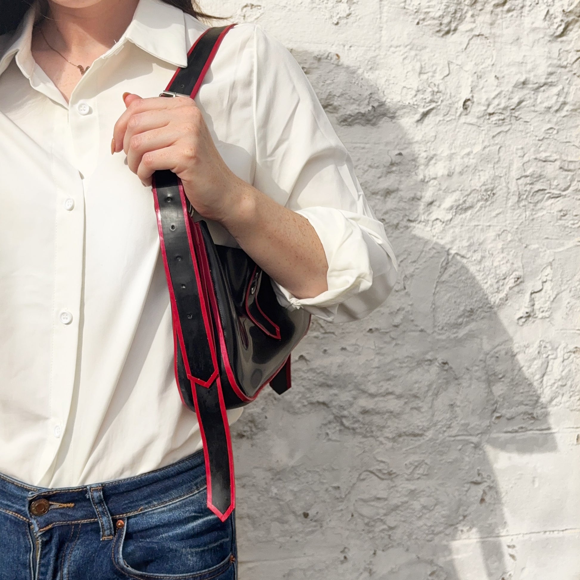 Black Handbags are made from double thickness 0.8mm latex making them 1.6mm in thickness (not including stiffening)